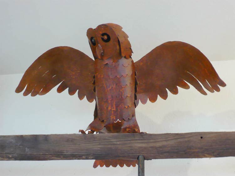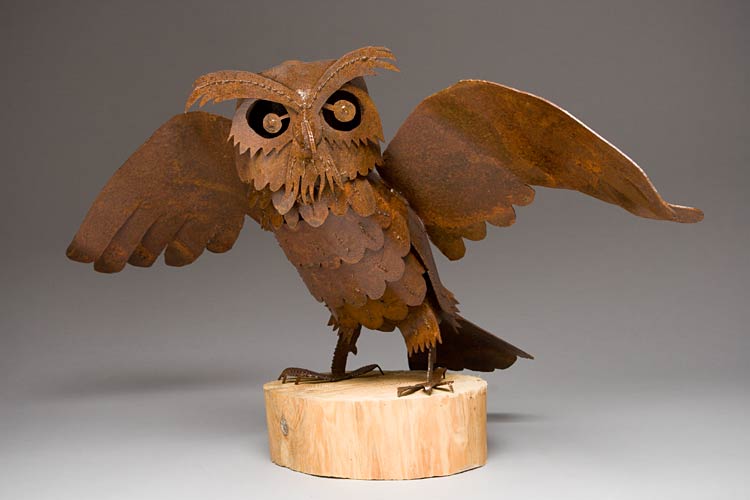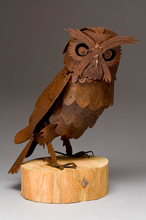 Each of Gunter’s owls has a personality of its own. Each owl is unique but fall loosely into one of the four categories shown. Gunter’s owls are cut forged, and welded out of 14g steel. They are rusted and treated with a clear varnish finish.
